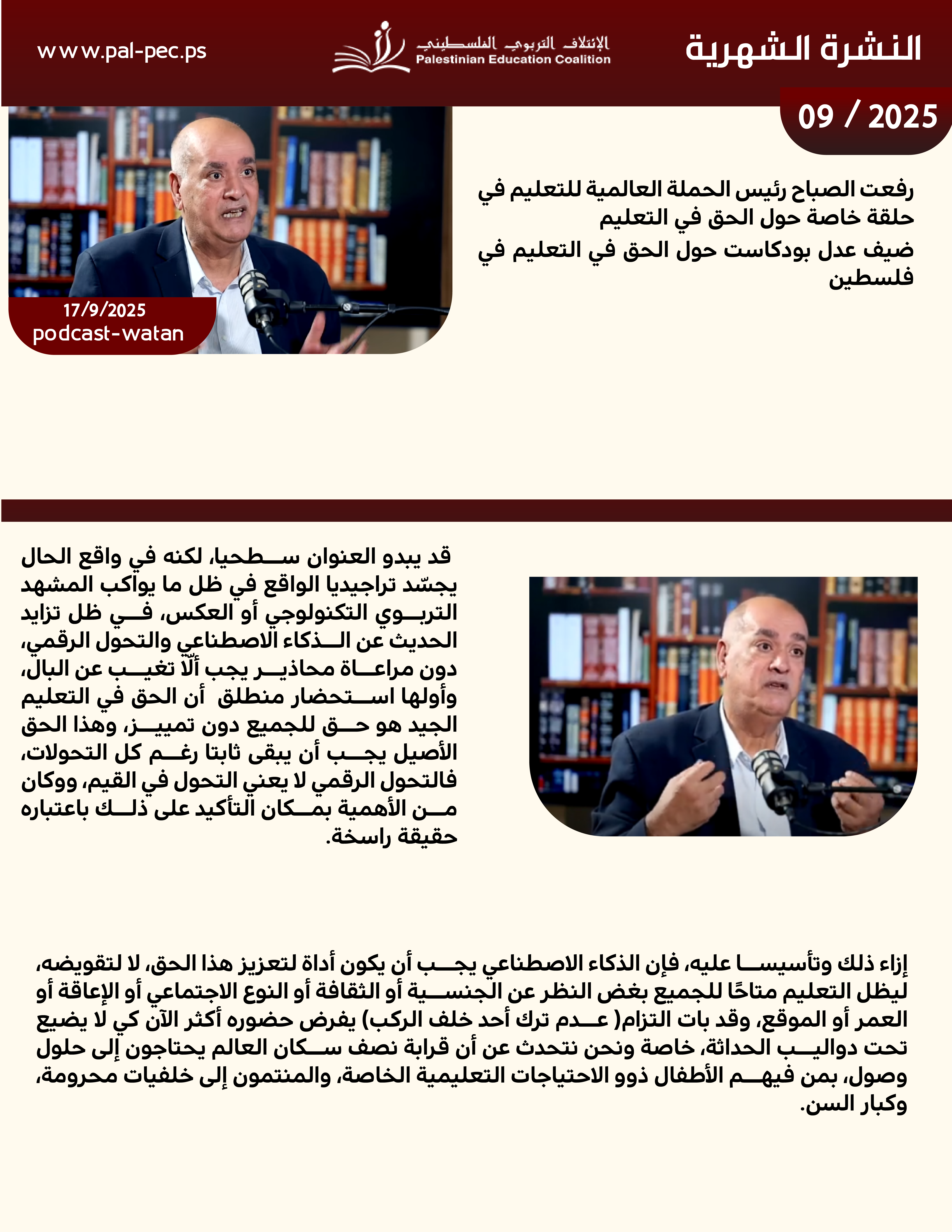 يسرنا أن نقدم لكم النشرة الإخبارية لشهر أيلول 2025، التي تسلط الضوء على أبرز الأنشطة والفعاليات التي نفذها الائتلاف التربوي الفلسطيني خلال هذا الشهر.