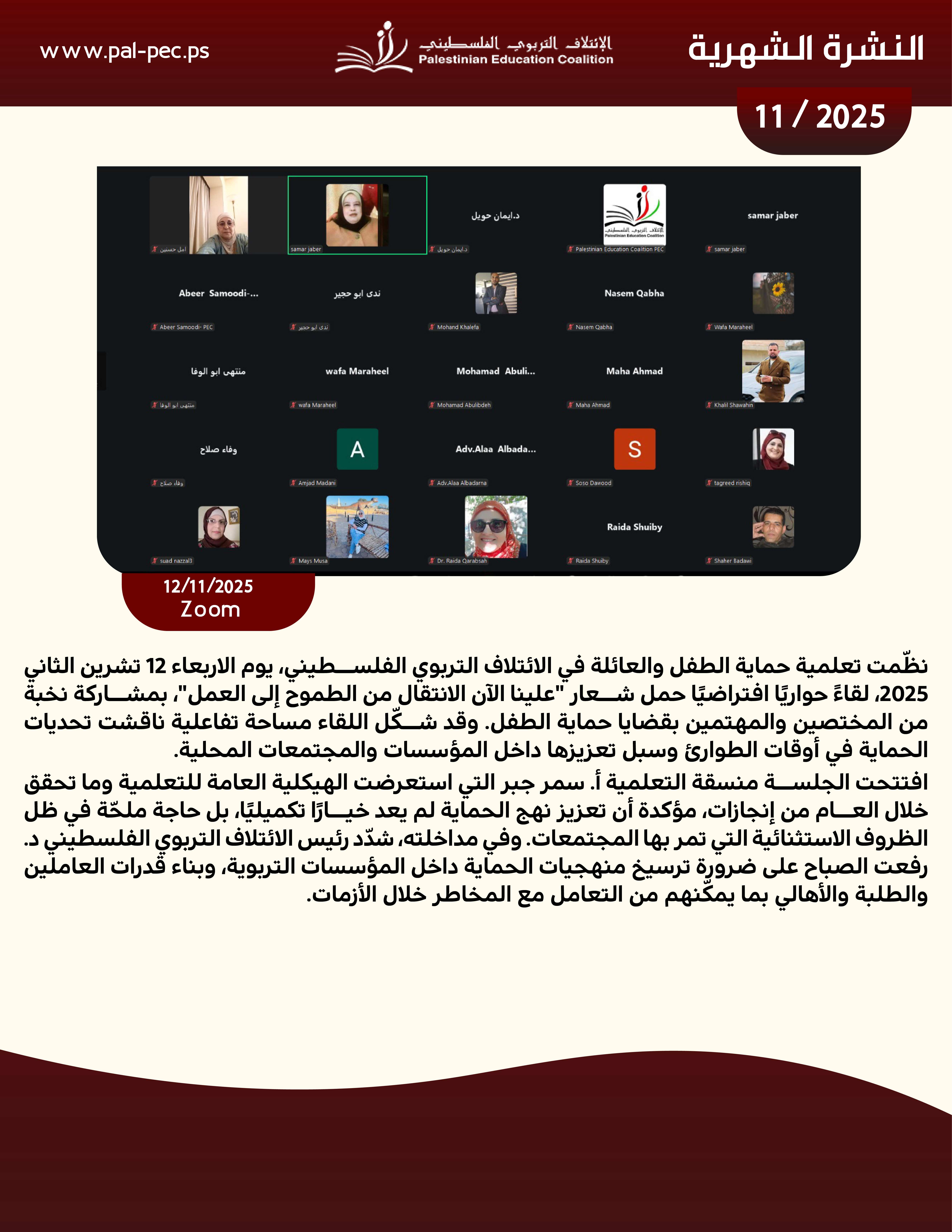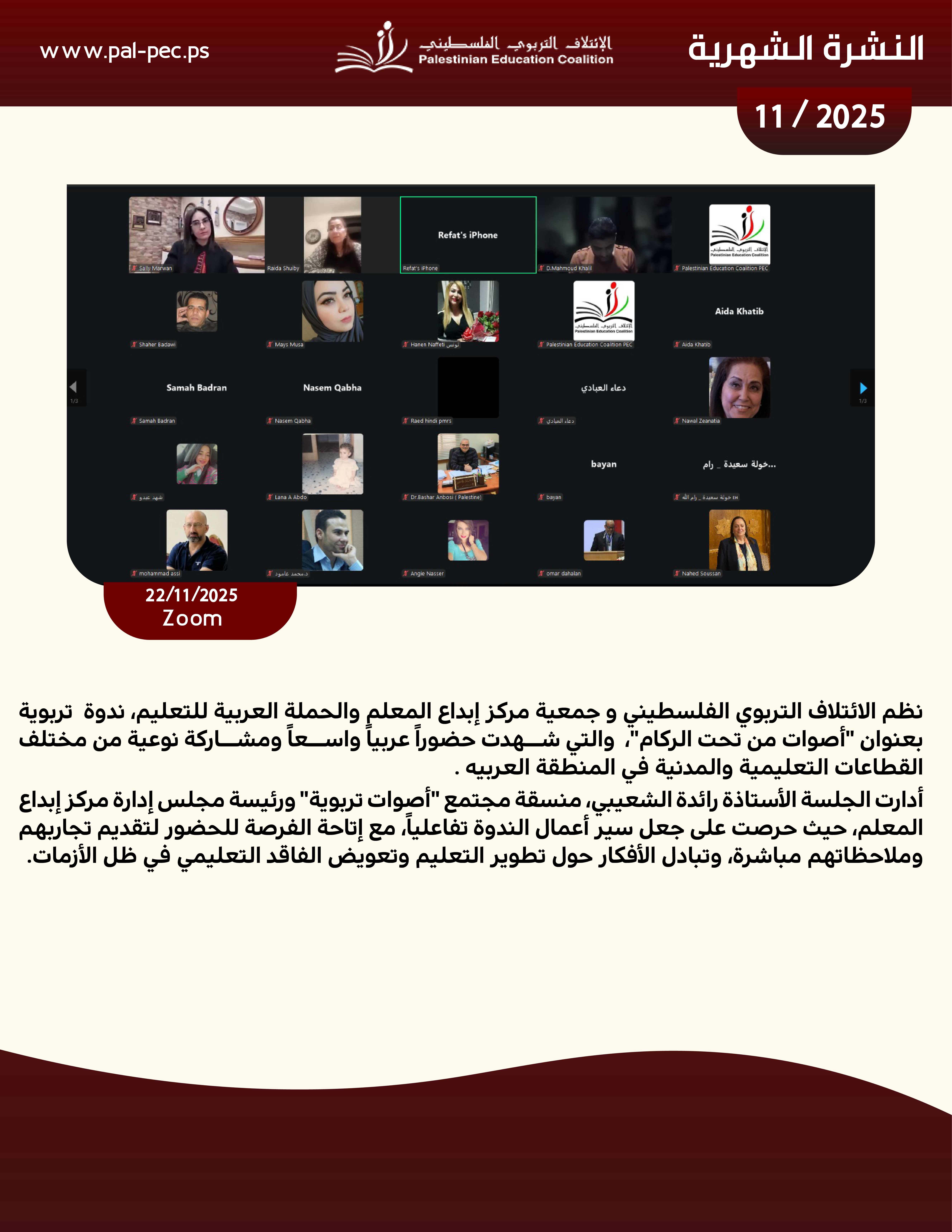 يسرنا أن نقدم لكم النشرة الإخبارية لشهر تشرين الثاني 2025، التي تسلط الضوء على أبرز الأنشطة والفعاليات التي نفذها الائتلاف التربوي الفلسطيني خلال هذا الشهر.