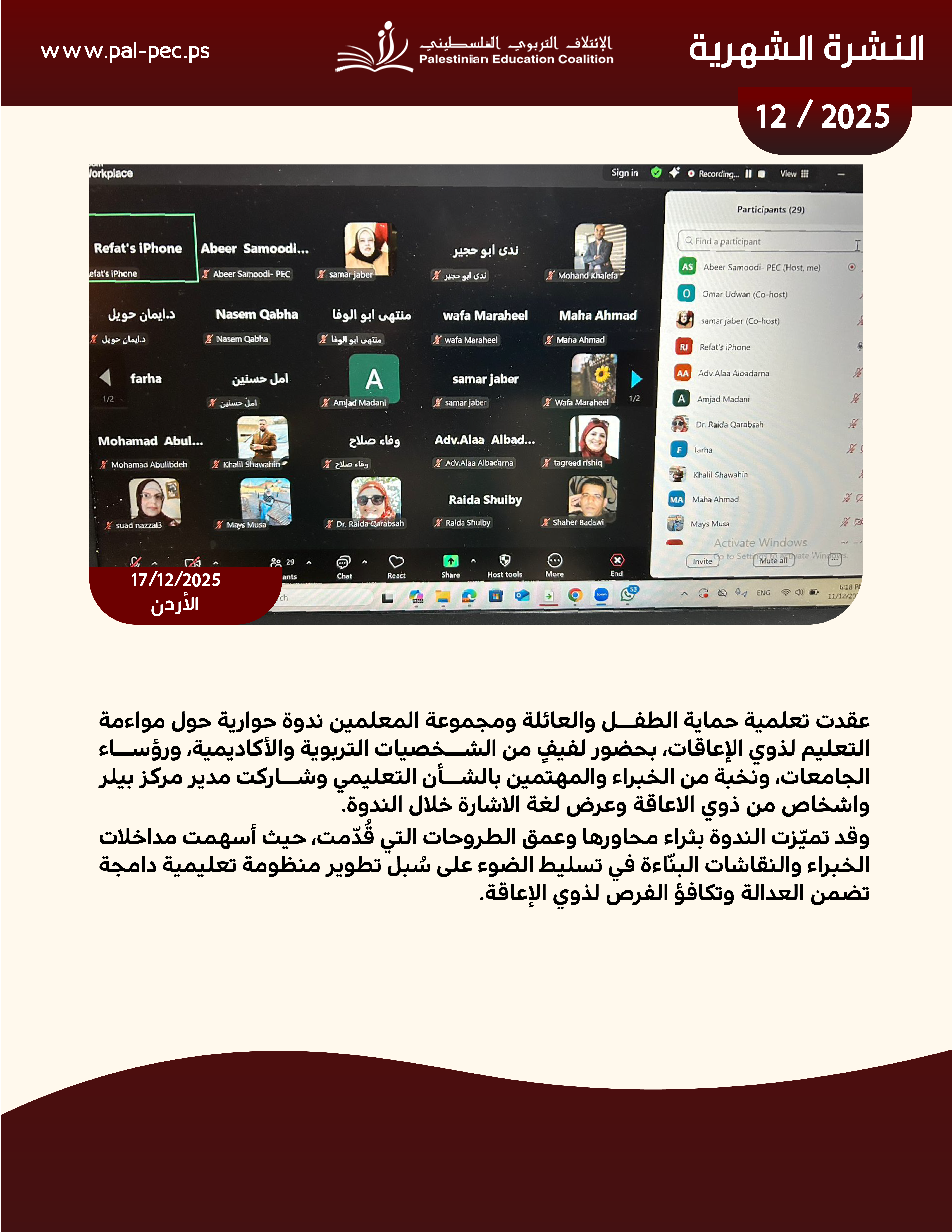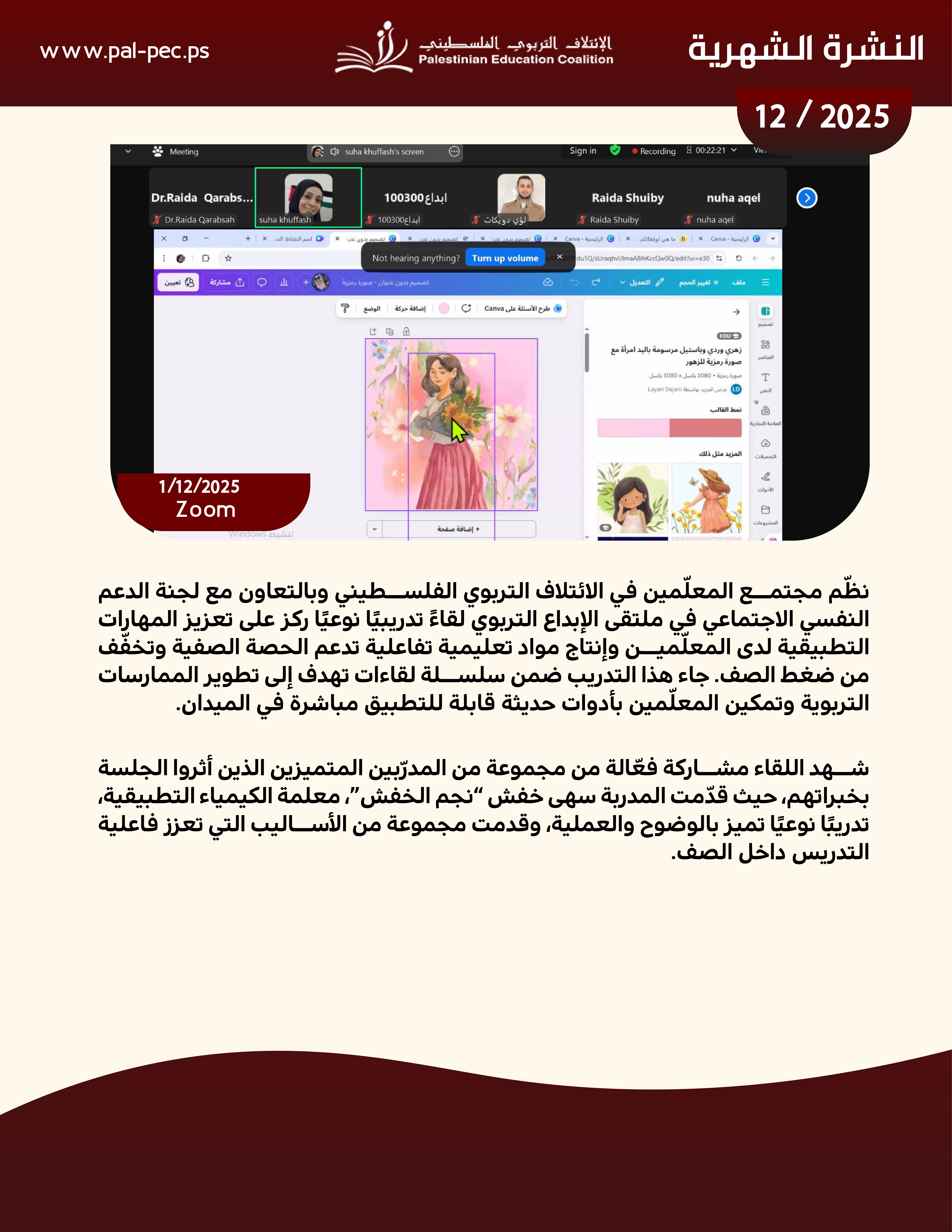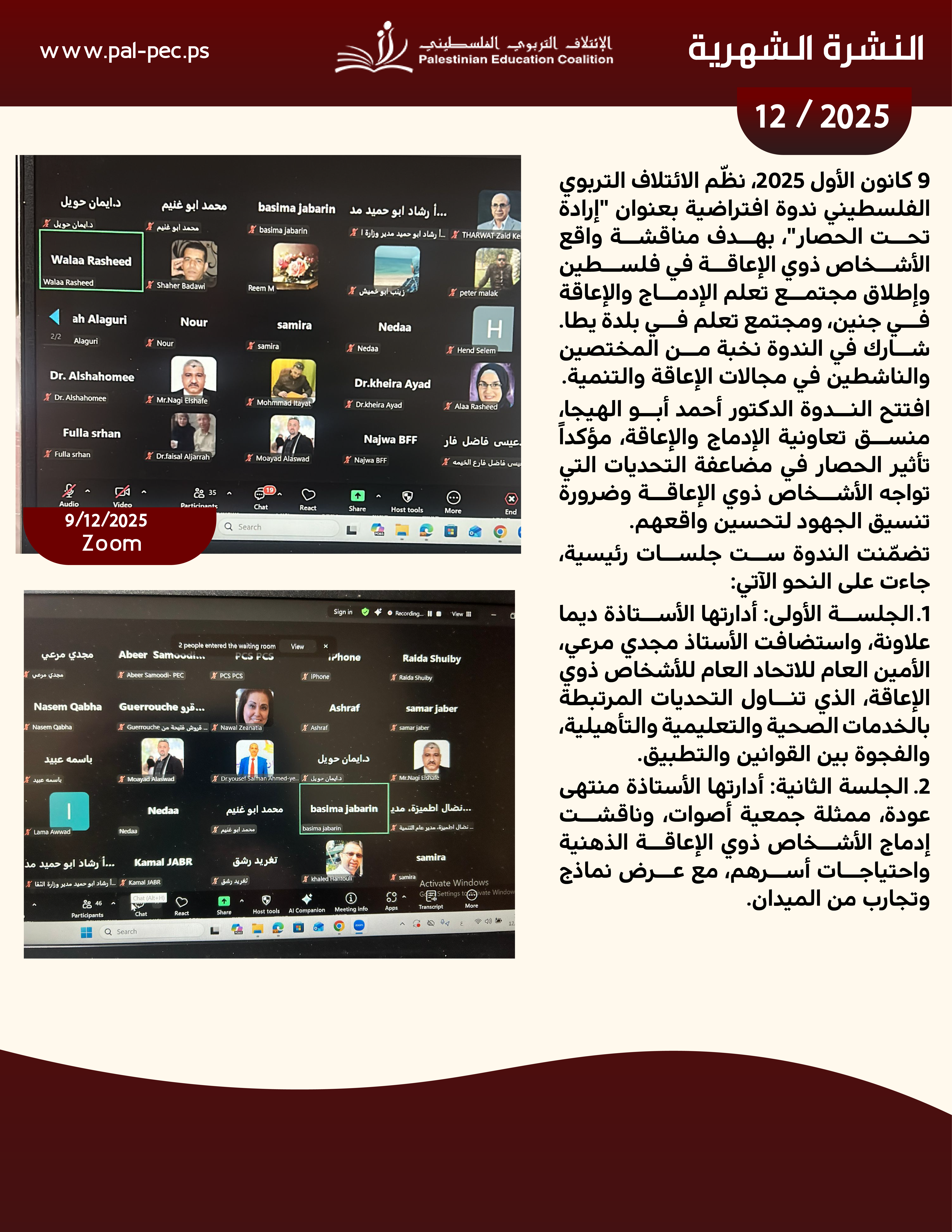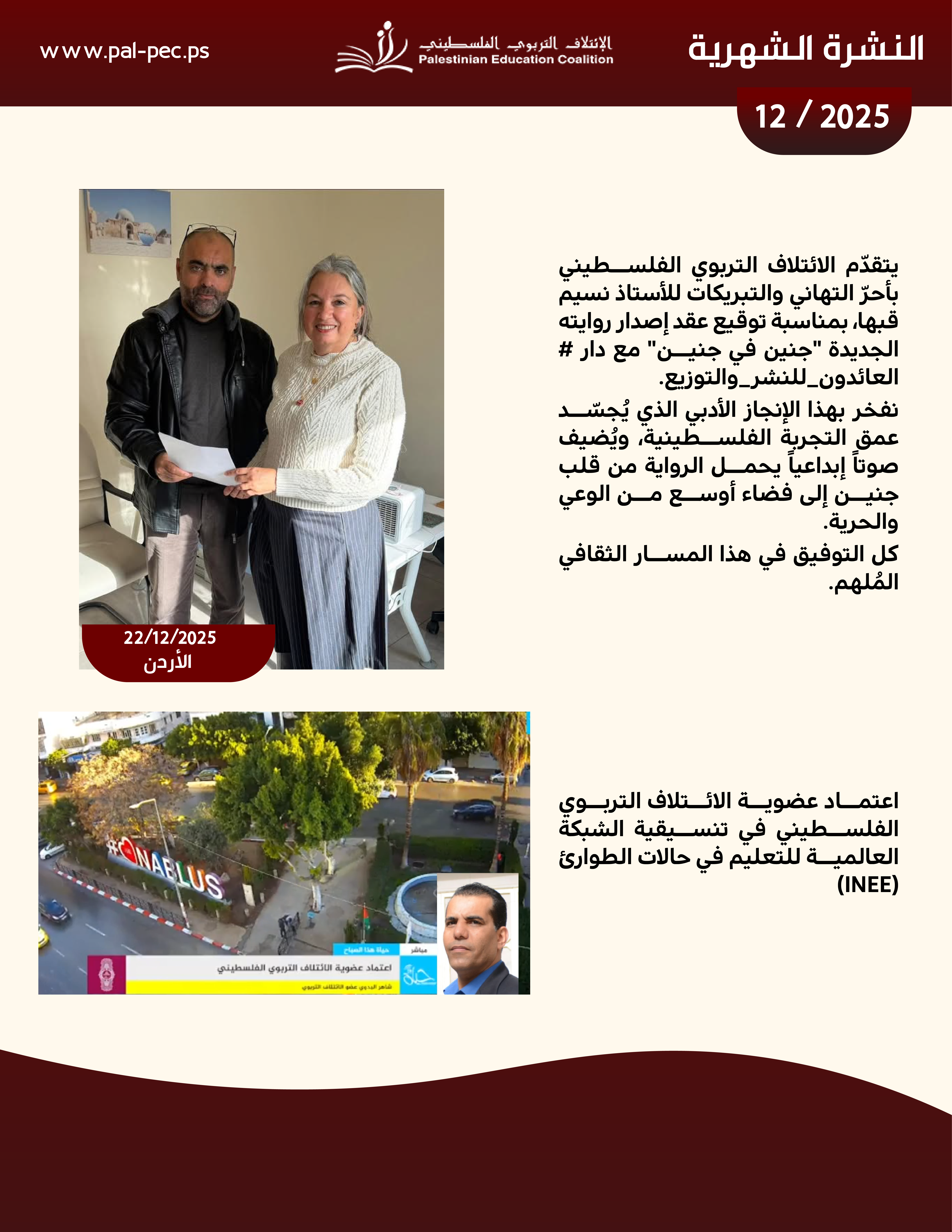 يسرنا أن نقدم لكم النشرة الإخبارية لشهر كانون الأول 2025، التي تسلط الضوء على أبرز الأنشطة والفعاليات التي نفذها الائتلاف التربوي الفلسطيني خلال هذا الشهر.
